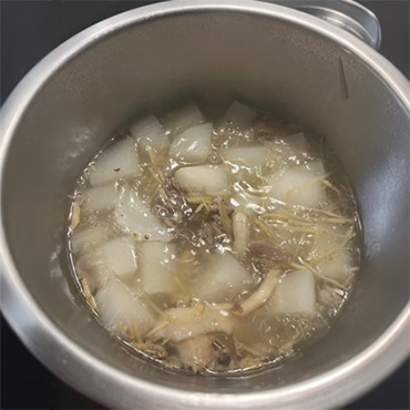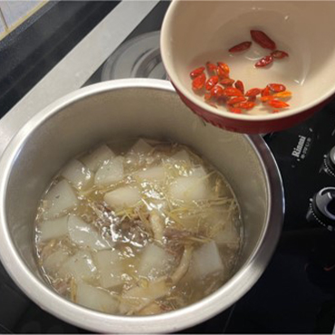4. 待蘿蔔熟透,枸杞稍微泡水後,連同米酒一起加入即完成。