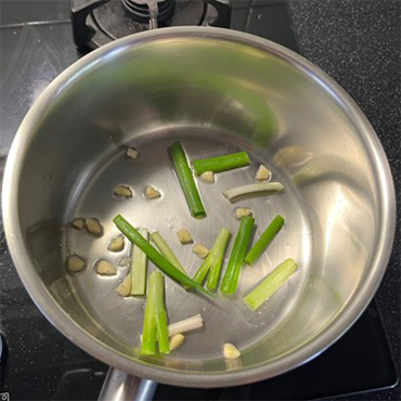2. 倒少許油(約 1 匙)入鍋放入蒜、蔥,炒至香氣出來。