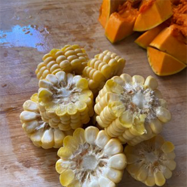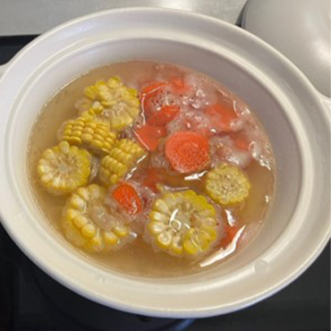 5. 先放入玉米、紅蘿蔔一起用小火煮滾 15 分鐘。