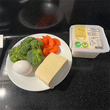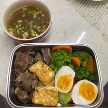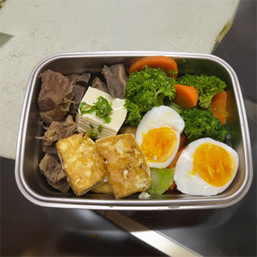 5. 將羊肉、花椰菜、紅蘿蔔、豆腐、蛋放入餐盒,依喜好可放入嫩豆腐增加變化(嫩豆腐可搭配蔥花)