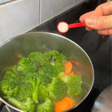 3. 備一鍋熱水,煮滾放入紅蘿蔔及花椰菜梗及鹽巴,煮滾 2 分鐘再放入花椰菜煮滾 2 分鐘。