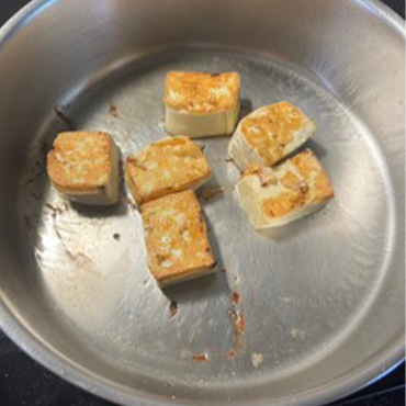4. 另備平底鍋煎板豆腐。熱鍋熱油後熄火放入板豆腐,以小火煎至金黃後翻面,至兩面金黃即可夾起。起鍋前可灑入黑胡椒提味。