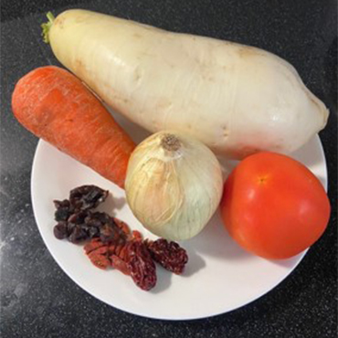 1. 白蘿蔔去皮切塊、紅蘿蔔切厚片、番茄切成 6 等份、紅棗中間劃一刀(以利入味)備用。