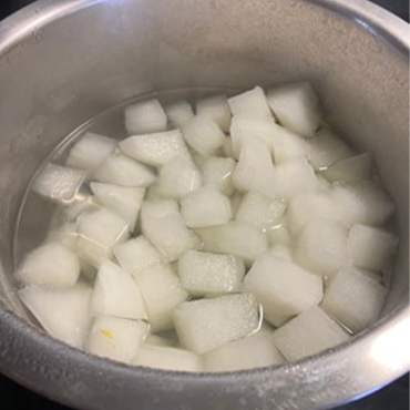 2. 備一鍋水先將白蘿蔔煮熟、煮透備用。