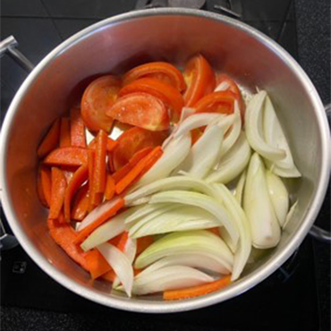 3. 另備平底鍋,倒入少許油,先炒紅蘿蔔再放蕃茄,炒至蕃茄兩面微變色後加入洋蔥繼續炒。