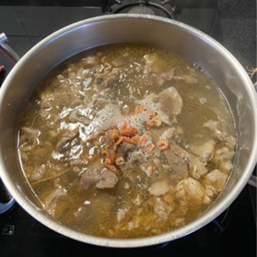 2. 將雅方溪湖小山羊解凍後倒出,因此湯底口味較濃郁,可加 1 碗水稀釋,同時加入小蝦米煮滾。