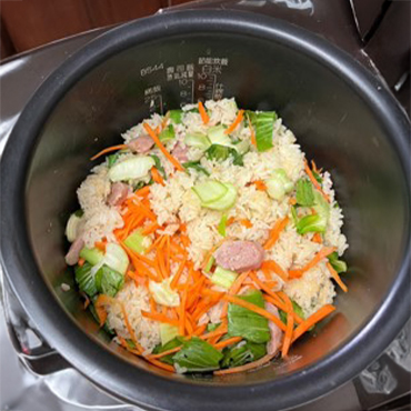 6. 待飯煮熟,開鍋放入紅蘿蔔與青江菜攪拌均勻,蓋鍋燜煮 20 分鐘,再開鍋即完成菜飯。