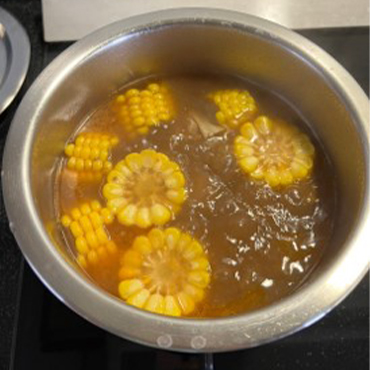 7. 另備湯鍋加熱剩餘羊肉爐,煮滾後,再加玉米一起煮約 20 分鐘至滾。