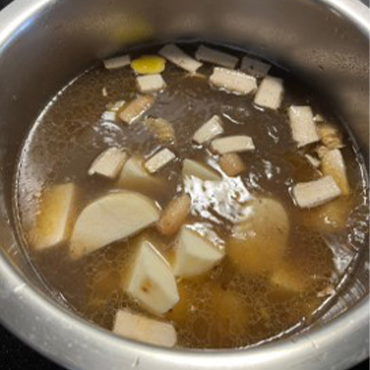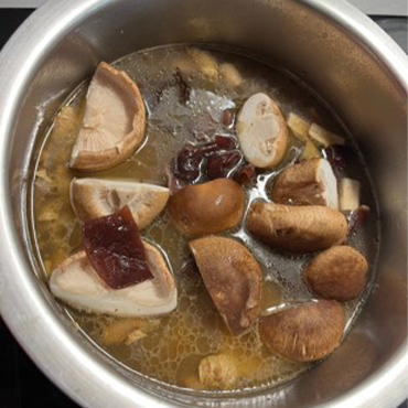5. 羊肉爐煮滾後放入切片的香菇蒂頭及薑,轉小火滾約 1 分鐘後加入山藥煮至 7 分熟(筷子可穿透山藥,但仍能感受到脆感)。